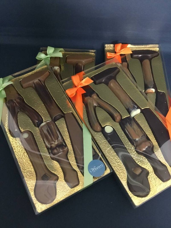 Met dit gereedschap-setje kan iedereen wel overweg. Melk of puur en gevuld me een heerlijke praliné !
